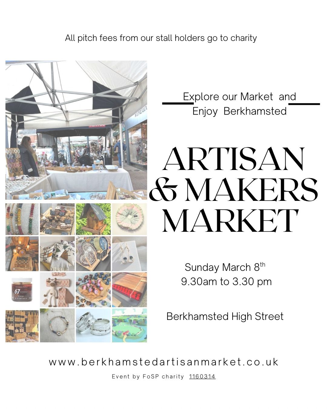 8 Mar | High Street | 09:30 - 15:30 | Berkhamsted Artisan & Makers Market — over 40 stalls with art, ceramics, jewellery, textiles, houseplants, gluten-free cakes and more. All pitch fees go to the Townhall Trust and Friends of St Peters